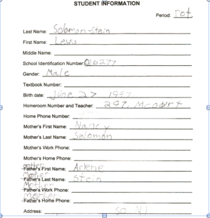 Lewis placed Nancy’s name in the space that requested information for his “mother,” and where it asked for information about “father,” he crossed out the word “father” and wrote in “mother,” with my information next to it.